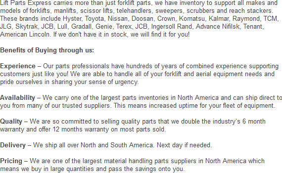 All our lift truck parts are offered at the best prices. If you are interested in receiving a quote for our attachments or parts, give us a call now at:
